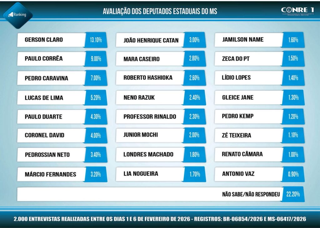 A pesquisa também aponta um índice elevado de aprovação da Assembleia Legislativa, demonstrando a confiança da população no trabalho desenvolvido pelos deputados estaduais. Nesse contexto, o posicionamento de Caravina entre os três mais bem avaliados reforça o reconhecimento popular de sua atuação, compromisso e presença constante junto aos municípios e à sociedade sul-matogrossense.